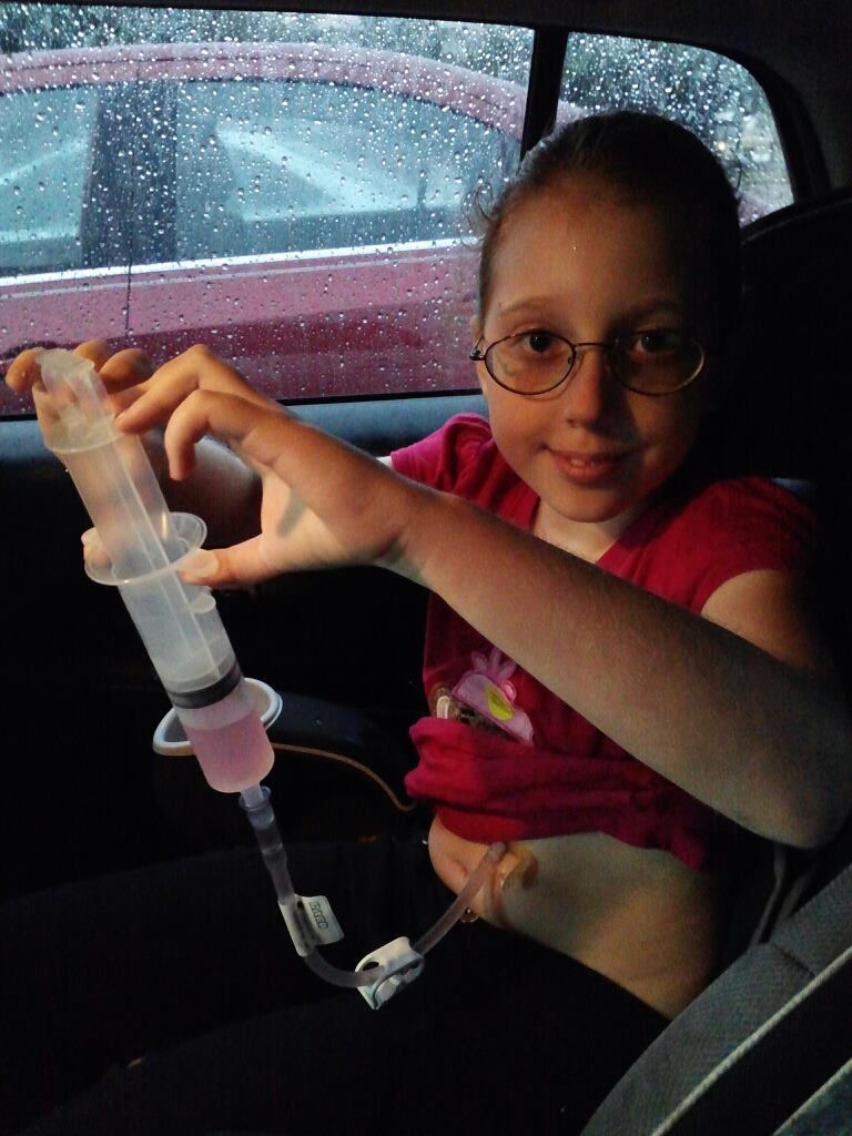 It took us about an hour to get to that gas station and then about another two hours to get home between the traffic, closed freeway, high water (we saw many cars abandoned in the water on our journey). We were in the car so long that we heard the entire KSBJ countdown! We had to drive on the wrong side of the road a few times. and there was a lot of u-turning and backtracking. I told K we were “adventure driving”! She said, “Do you know what I would rather be doing than adventure driving? BE AT HOME!” She did a pretty good job of holding it together for the most part, but she did break down a few times. It is hard to feel trapped and unable to get home in a flood, especially when you are 8 and very afraid of storms! But eventually, we made it home safely. The whole thing reminded me of two important things. One, I need to keep that emergency bag up to date and properly stocked (now it has a can of Elecare, bottle of water, container for mixing, 60ml syringe, bolus tube, 10ml syringe, an Underjam+wipes, and a couple of her meds)…and two, everything is just a teensy bit more complicated with K, even already complicated things like getting temporarily stuck in a flood!
