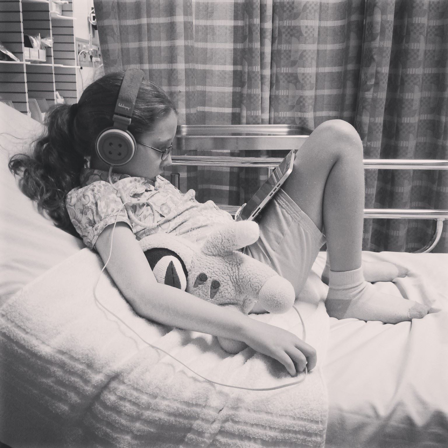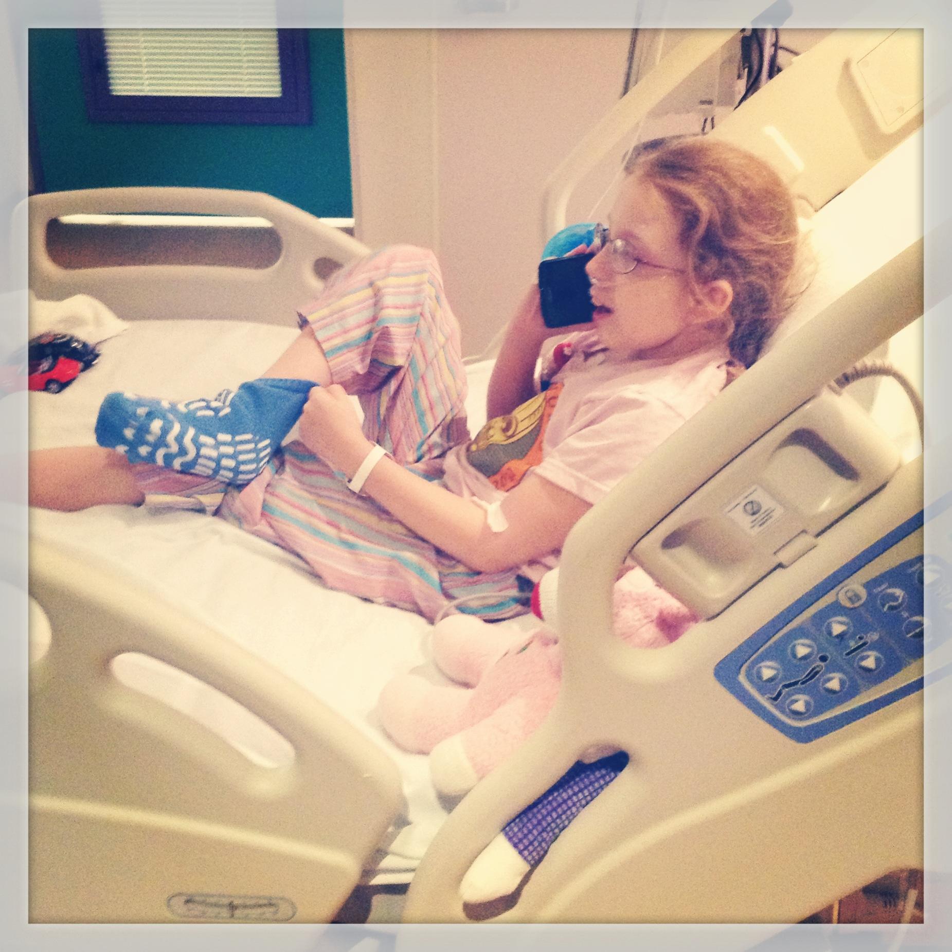 As soon as we were in a room, the attending came to check on her, followed by a resident, two nurses, someone from Child Life, and 2 students who were observing. Our tiny room was PACKED. They tried to start an IV, but K was super upset and struggling and it blew before it was ever placed. She kept screaming, “I surrender! Why are you still hurting me?!” So they made a second attempt and got the IV placed, but it wouldn’t give any blood…so they had to stick her a third time to get blood for her urgent labs. It was veeeeery unpleasant. They got her hooked up to her oxygen and left us to rest once her fluids were running. It was QUIET in that room. Too quiet for a room that contained K! She basically slept for hours and woke up when someone from IR came to get her to place her new tube. I was SO nervous about how she would do with her tube placement as being awake for it is a first for her, but evidently she handled it like a champ. The hardest part was pulling out her old tube, but she found the rest (watching the placement in her intestines via the fluoroscope) very cool. They came out laughing and telling me she was so funny and that she mentioned she has a husband with a GJ tube, too. Of course, she did! She mentions him just about anytime she can work it into a conversation.
