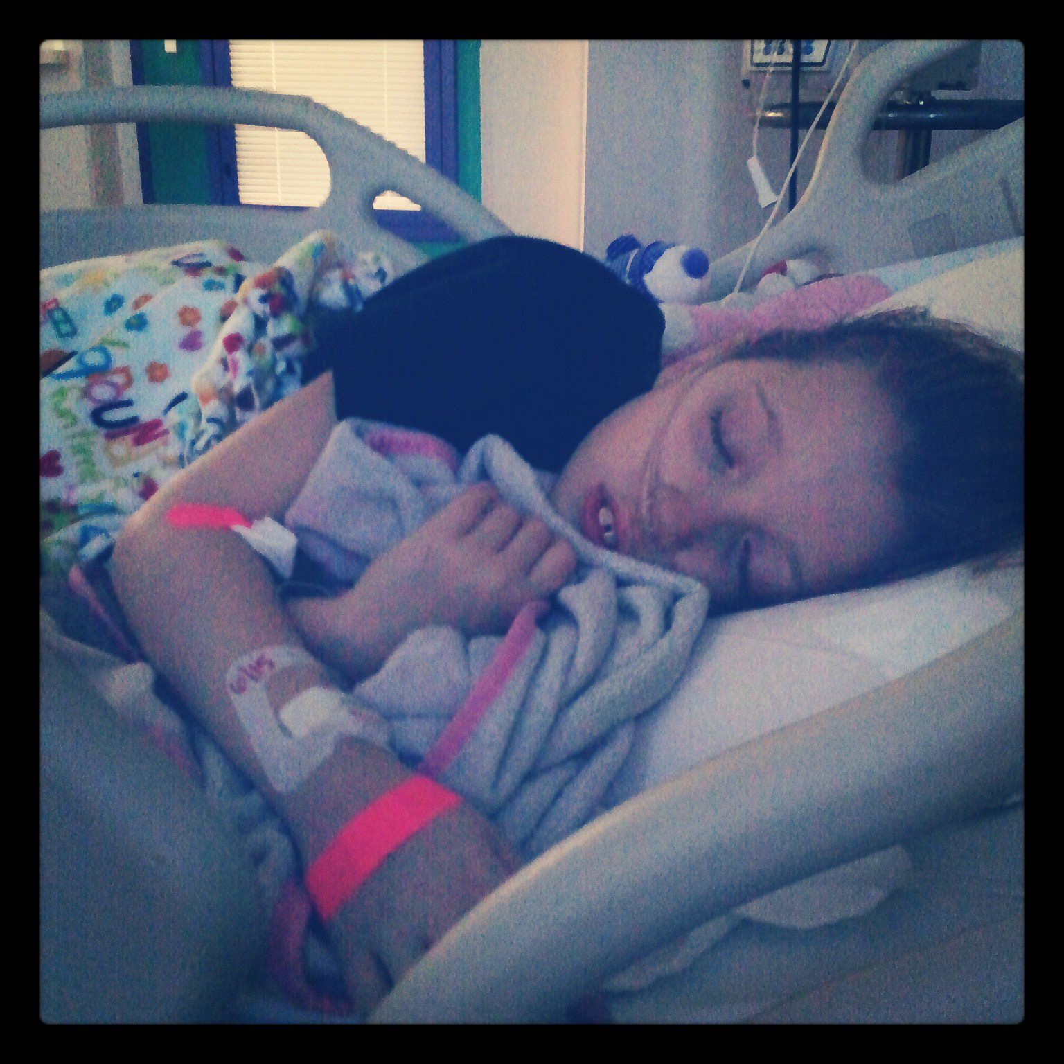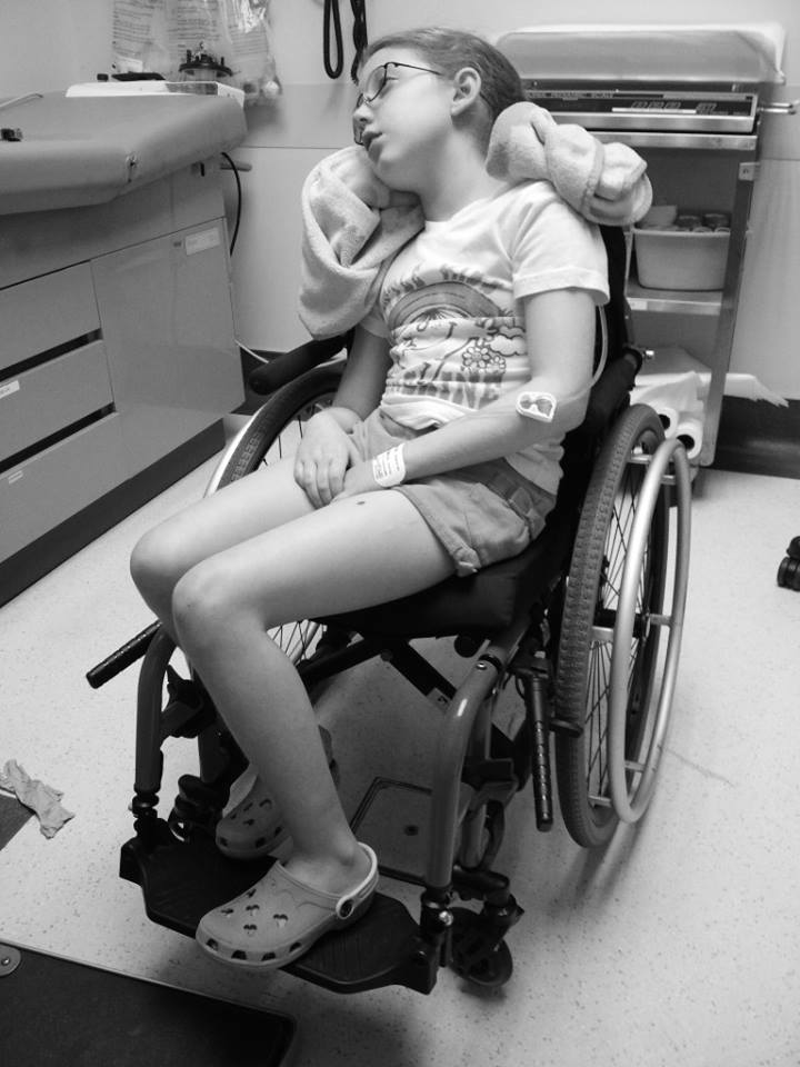 On the ride home, K started to complain of being “too full” and looked pretty green in the backseat, so when we got home, I hooked her up to a Farrell bag (a bag that allows stomach contents to drain) and basically all of the formula came out. Fast. She had been fasting most of the day because of the broken tube (and she hadn’t gotten all of her feed that morning at science camp because she had shut it off because she was annoyed by the error beeps), so we were really already behind the eight ball, but she was not feeling right and we couldn’t push it. I had to leave her hooked up to continue venting and she went to sleep. Not long after that, she woke up and vomited. She slept for a while and then vomited again early Thursday morning. She also had a fever of 101.7. I gave Zofran and tried to give some clears by tube, but she couldn’t tolerate it. She peed and was spilling a large amount of ketones (one of her red flags) and was very lethargic, so we went to the ER. It was so different compared to the day before. Poor kid could not even hold her head up in her wheelchair. It was sad. I gave them our protocol letter in triage and from that point, they worked fast.
