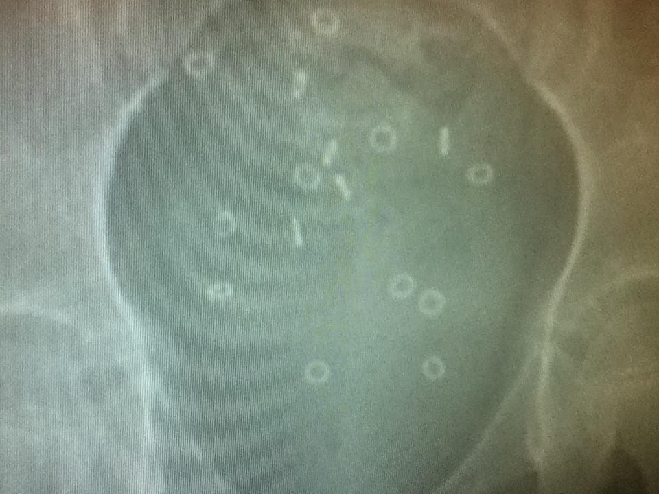 I’m a little behind here! Waaay back in June, before the perfect storm and all that came with it, K saw her motility specialist for the first time. Her ordered a sitz marker study, which we put off until the last possible minute because I did not think I was going to be able to get K to swallow those tiny plastic Os. However, she surprised me! I hid them in her baby food peas and while she caught me after a few bites, she agreed to keep eating them. YAY! So we started her x-rays that morning and returned on the 3rd and 5th days for more films at the same time of day. The last x-ray was done on a Monday and her follow-up appointment was on Tuesday. Perfect timing!