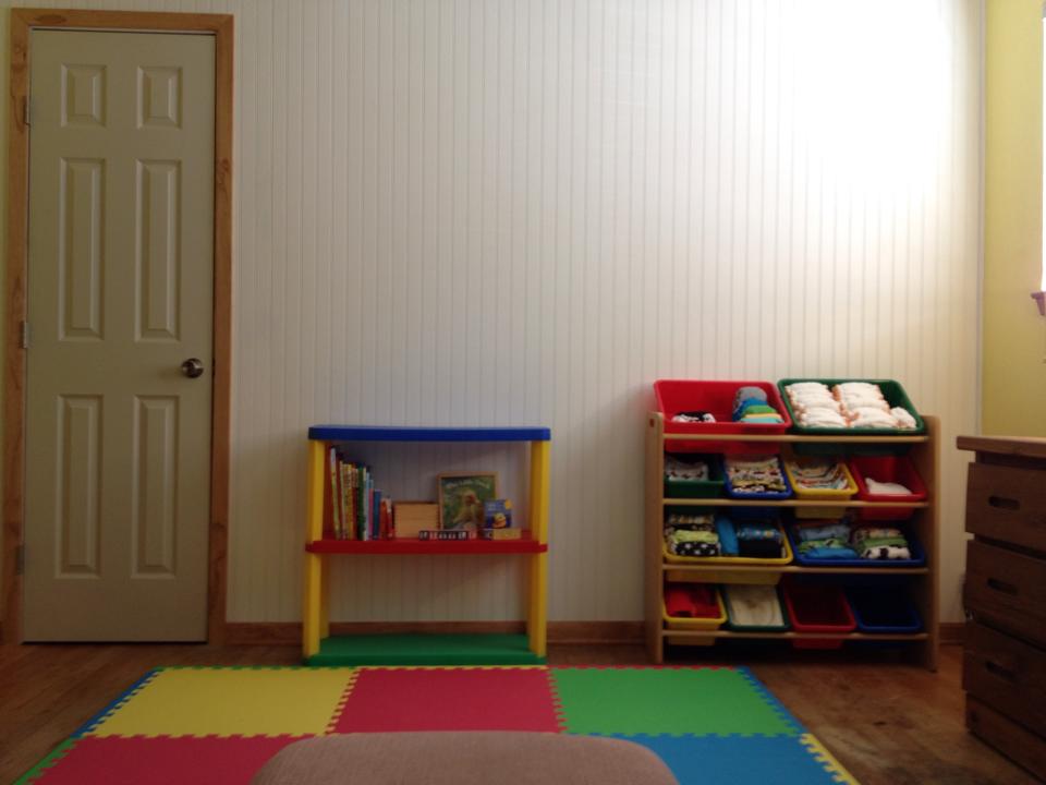 What else? Hmm. I’m seeing a midwife this time around and plan to deliver at the birth center instead of a hospital. My births have been without complication and I never get an epidural anyway, so it just feels like the most supportive environment for that kind of birth…not to mention the cost difference. It will be a new experience, though! We also plan on cloth diapering, so figuring all that out has been a fun learning experience, too. Even though we got rid of pretty much all of our baby stuff since K, we are pretty well stocked already at this point. Friends and family have been very generous with passing things on to us and we’ve had good luck with finding other items secondhand. It has been neat to watch God provide all the various things we need (and want even!)…down to funds for renovations and such! Here is a peek at the nursery (I’ll try to put up a post with reno pictures soon. Josh did such great work!), but of course, we still have decorating and such to do in there: