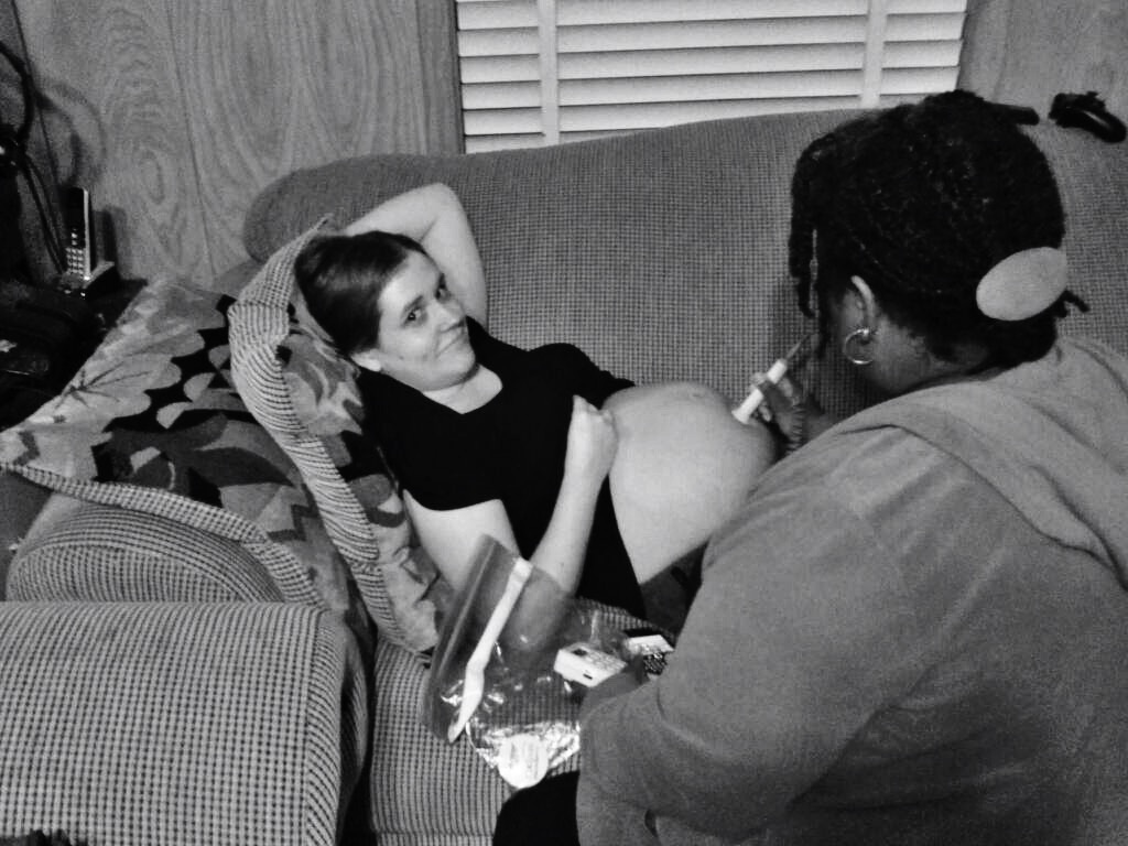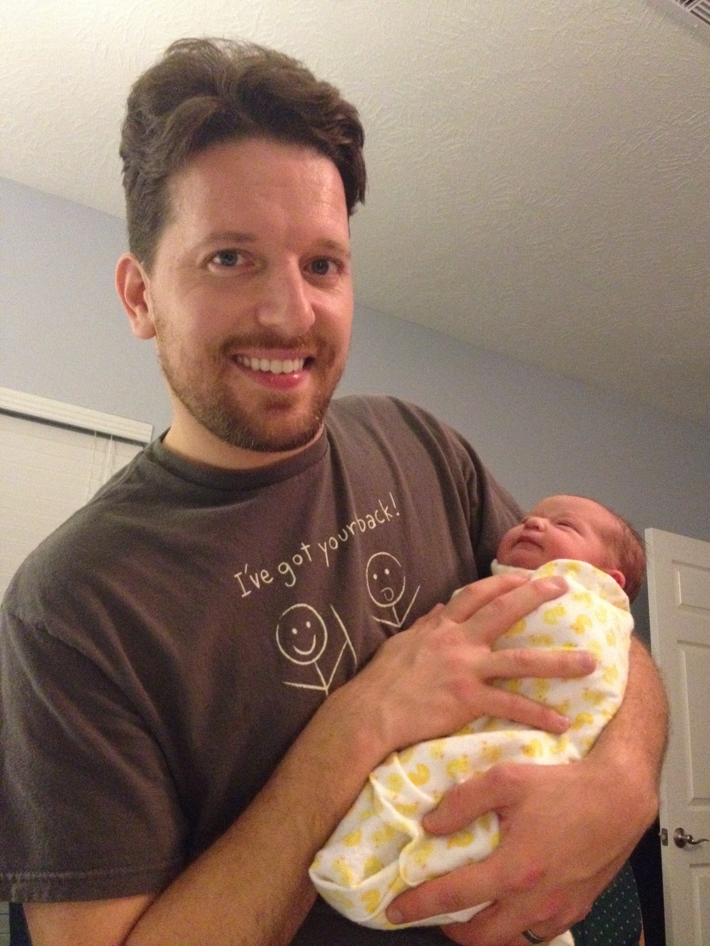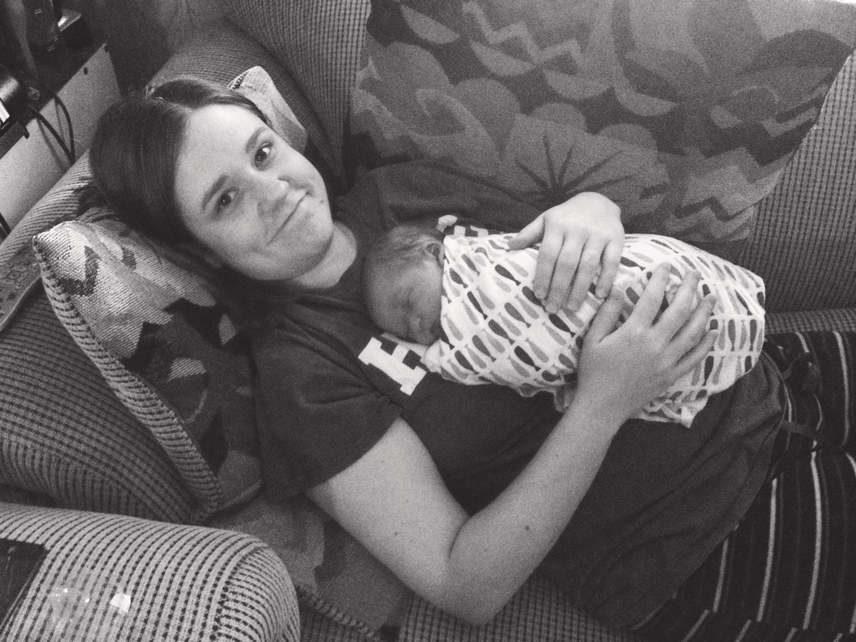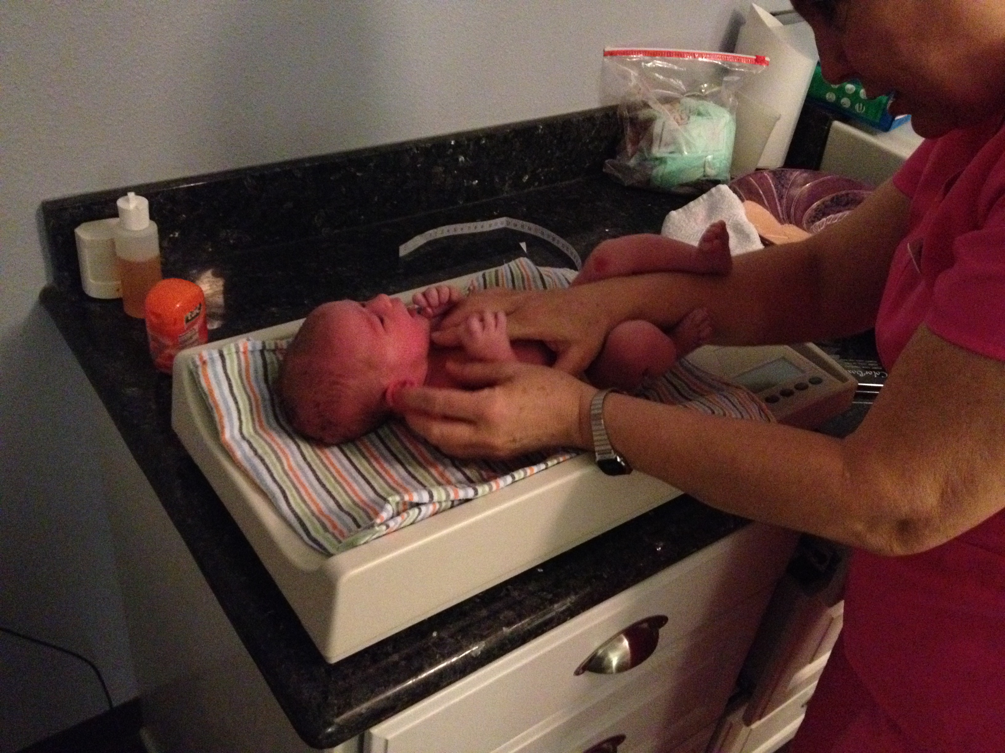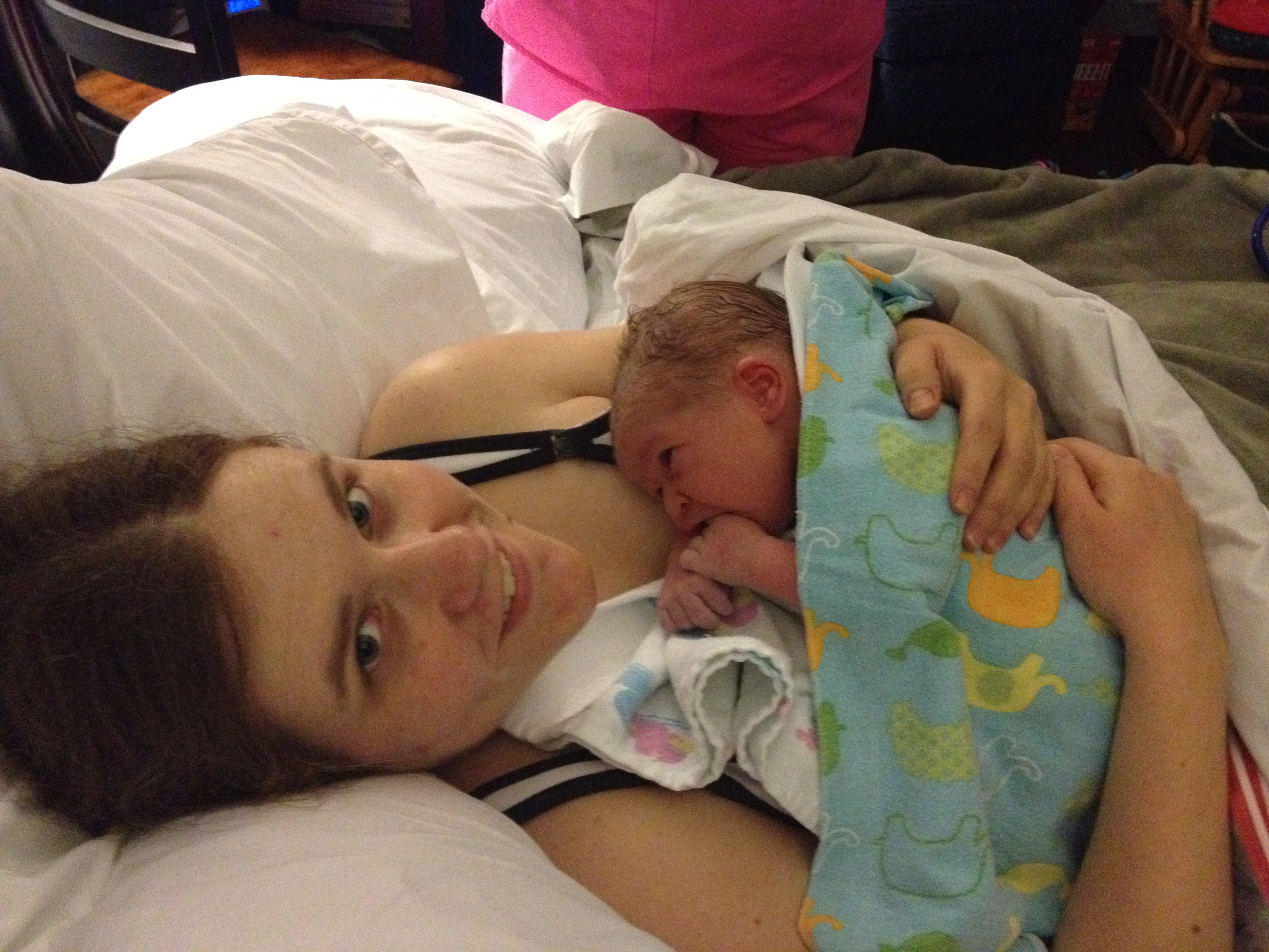 First, I’m going to backtrack a bit. On Wednesday the 8th, I went for a biophysical profile ultrasound and had a follow up visit with the midwife. Everything looked great, but we found out that if I didn’t have the baby by the following Tuesday, we’d have to get transferred over to OB care which we REALLY didn’t want. We weren’t planning on having my membranes stripped, but since we were in a time crunch we went ahead and had that done at my appointment. It gave me some contractions here and there and eventually they settled into a regular pattern and I was up part of the night that night timing them, but they eventually tapered off. The same thing happened the following night, but again, they tapered off. Then on Friday morning, my water broke! That was a new experience, didn’t happen with either of the other kiddos. This started a second clock, because they really don’t like you to go more than 48 hours without delivering once your water has broken. Josh came home early that day and we spent the day trying to encourage things to move along with walking and clary sage oil, but Friday was a pretty calm day. The midwife came and checked on me and Little Duck that evening and we were both doing great! Once night hit, I started having some regular contractions and we were up all night timing them, but again, they tapered off around 4am and we slept for a couple of hours. The midwife gave us the morning to try to get things moving along again, but it just wasn’t quite happening so we went in to have a Cook catheter placed to help me efface and dilate. Josh got to be the assistant and fill the balloons. He was a good nurse. Basically, the catheter puts pressure on both sides of the cervix and irritates the uterus into contracting and comes out once you hit 6cm. It didn’t take too long for contractions to pick up and by 4pm we were timing them again. We went back to the birth center at 8:30 to have the catheter checked, but it was still snugly in there so they advised us to go walking when we got back home. I was having some pretty strong contractions, so we only made it a few houses down the block (with lots of stopping to wait out contractions) before we headed back home. It seemed like a bad idea to be loitering in front of people’s houses in the dark and I couldn’t make it more than a few steps before I had to stop again. I went to the bathroom when we got back and BOOM! the catheter was out. We let the midwife know and she said we were fine to keep laboring at home until we felt like things were getting close to delivery. So, that’s what we did! We were both pretty tired from the lack of sleep the previous nights and I was unable to lay down at all that day because the contractions were extremely painful if I did, so I mostly hung out on the birth ball which was the most comfortable place to be…but we noticed things would slow down a little if I sat too long, so Josh would watch the clock and remind me to stand and walk every 4-5 minutes if a contraction hadn’t started up. Around 10 or 10:30, I went ahead and took a shower to be ready for when we went in and pretty soon after, I started feeling a little queasy with some of the contractions so we texted the midwife and decided to go in around 11:30 or so.