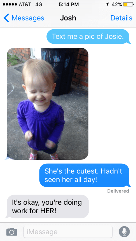 It was a long day of waiting with 3 hours of driving added on both ends, but it was worth it. Speaking up for what is right is always worth it and we all have the power to use our voices and stories in powerful ways. I hate public speaking, it cannot be overstated how much I HATE public speaking. I had that buzzy, adrenaline-fueled, feeling of anxiety from the time I decided to go until the time it was done…then I had the shaking hands of relief for a good 5-10 minutes. I barely slept the night before. I’m sure my voice quivered the entire 1 minute and 58 seconds that I was speaking, but I DID it. And I couldn’t have done it without my super husband cheering me on. In fact, I didn’t even think going to testify in person was an option, but he encouraged me to go and took my day shift of parenting so that I could. When I was missing Josie, this is what he sent me: